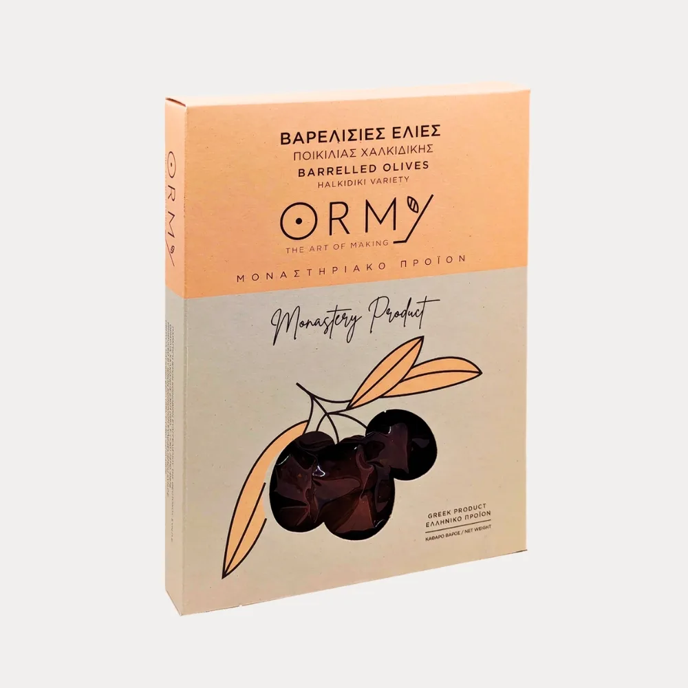 Czarne beczkowane oliwki odmiany Halkidiki są przygotowywane przez Siostry z klasztoru Ormylia według tradycyjnych receptur, dzięki czemu zachowują swój unikalny smak i wyróżniają się wielkością.